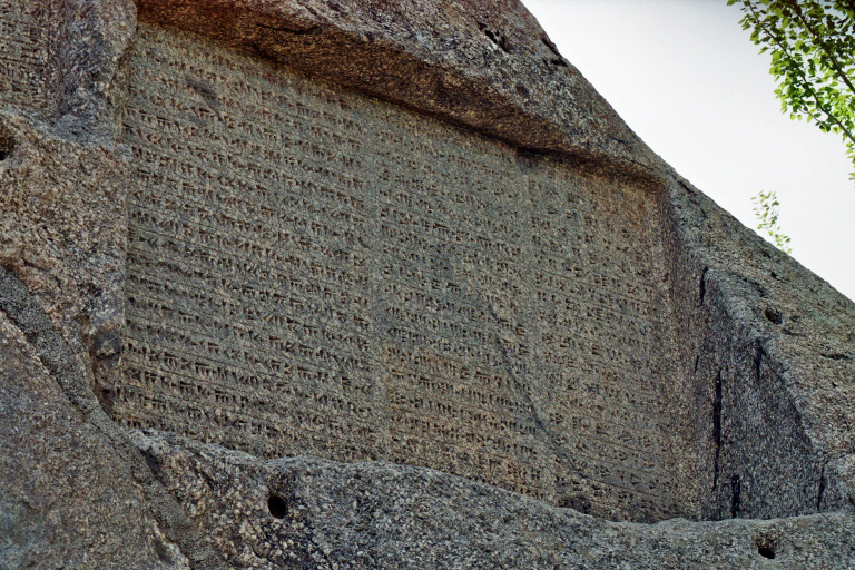 Nicht weit vor Kermanshah gelangt man an eine hochaufragende Felswand. 60 m über dem Talboden ist das Felsrelief von Bisotun in die Felswand gemeisselt worden. Hier führte die alte Königsstrasse nach Babylon durch. Das Relief stellt König Darius und die von ihm besiegten Feinde dar. In der in Keilschrift in 3 Sprachen (Altpersisch, Babylonisch und Elamisch) verfassten Inschrift rechtfertigt Darius seine Amtseinsetzung als König.
