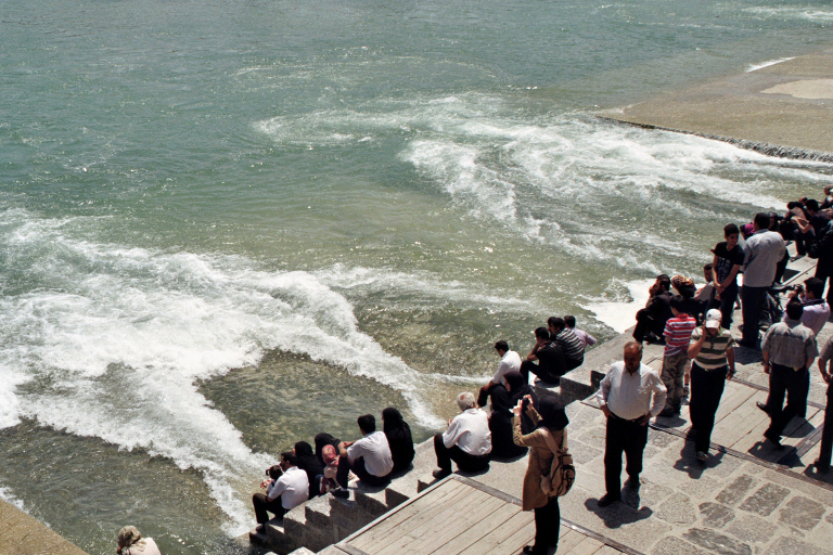 Die Brücke kann auch auf der Höhe des Stauwehrs überschritten werden. Auf den Stufen des Stauwehrs kann man sich, wie das Bild zeigt, am Wasser erfrischen. Die Pol-e Shahristan liegt etwas
