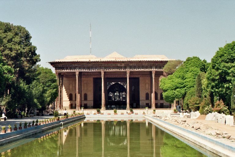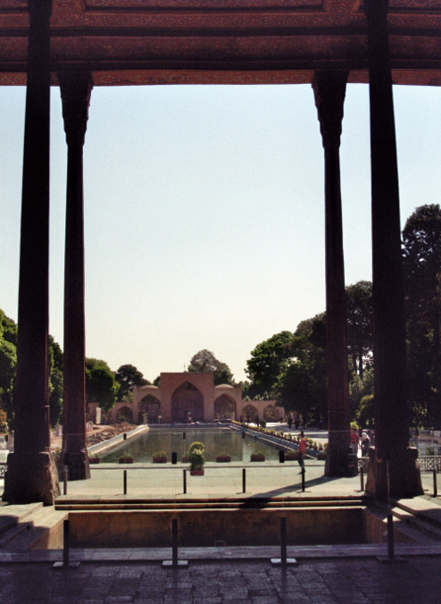 Der Chehel Sotun, der Palast der 40 Säulen, liegt nicht weit vom grossem Platz weg. Das Vordach wird von 20 Säulen gestützt. Die anderen 20 Säulen sieht man als Spiegelbild im Wasserbecken davor.