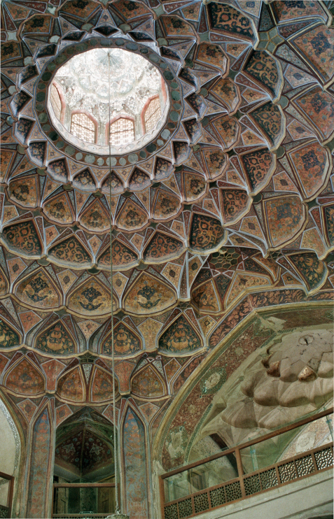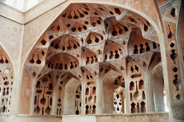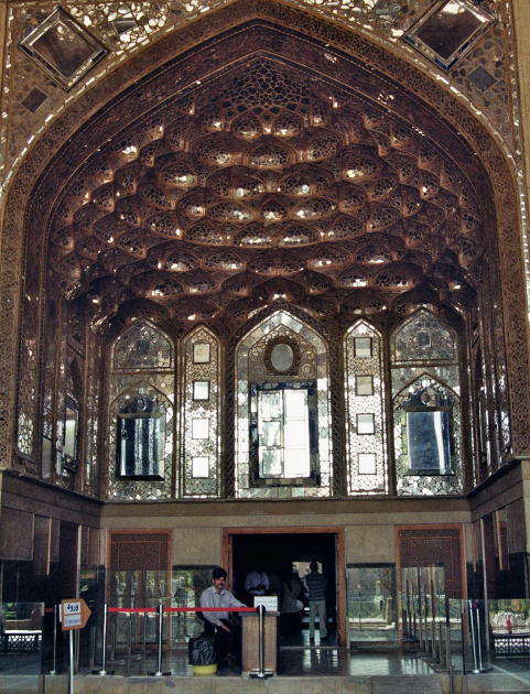 Von einer Terrasse vom Ali Qapu-Gebäude kann man den Platz von oben überblicken. Leider hat das Gebäude sehr hohe Stufen, so dass es recht anstrengend ist, hinaufzugelangen. Zuoberst ist ein Musikzimmer. Die Oberfläche der Wände wird durch ausgeschnittene Formen vergrössert, was die Akustik verbessert.