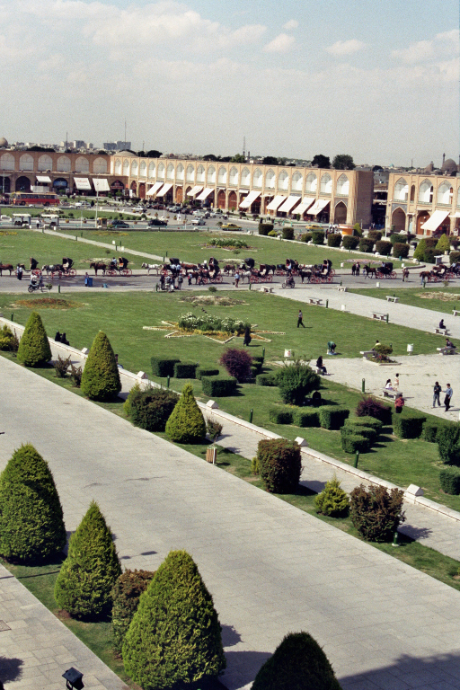 Jede der vier Seiten wird von einem hervorstechenden Bauwerk beherrscht. Im Süden des Platzes befindet sich die grosse Moschee Masdjed-e Imam, im Norden der Eingang zum Basar. Im Westen der Eingangspalast zur königlichen Residenz (Ali Qapu) und im Osten die Lotfollah-Moschee.