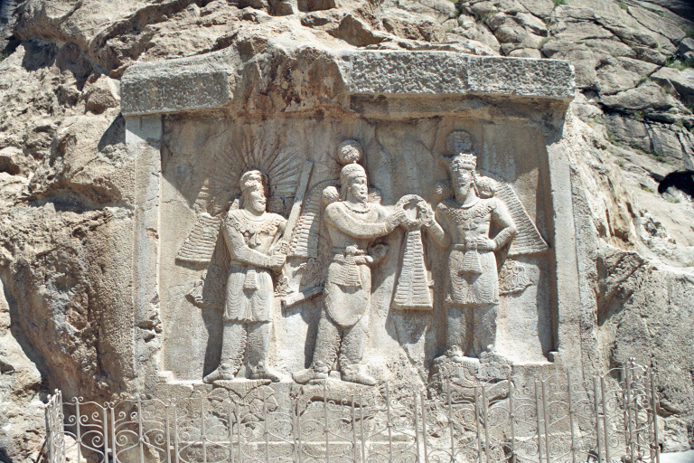 Im Bild überreicht der Gott Ahura Mazda dem Herrscher Ardaschir II. einen bebänderten Ring als Symbol für die Königswürde.