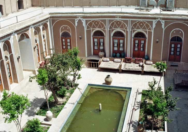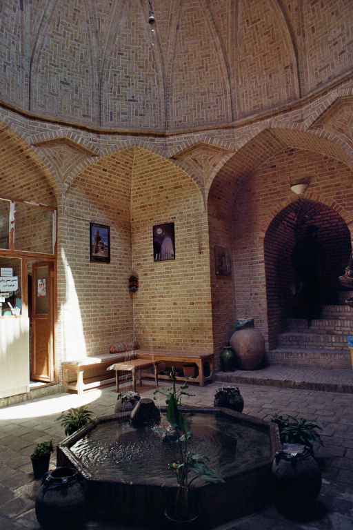Im Hof unter einer Kuppel speist ein Qanat einen Brunnen. In der Decke der Kuppel ist ein runde Öffnung, durch welche die warme Luft entweichen kann. So bleibt es auch in der Hitze des Nachmittags schön kühl.