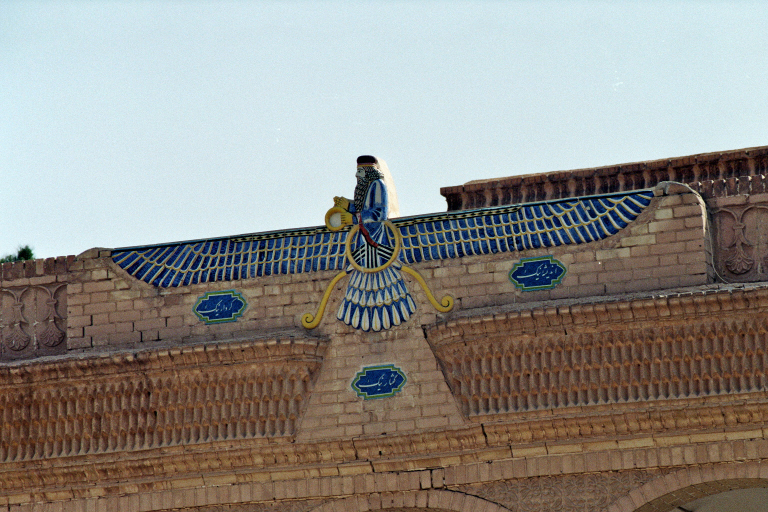 Das Symbol Faravahar des Zoroastrismus oben am Tempel