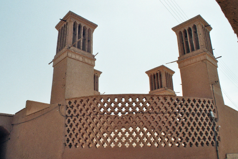 Im Wüstenklima ist eine spezielle Bauweise erforderlich, um die Häuser mit Wasser und kühler Luft zu versorgen. Dafür dienen die Qanate und die Windtürme.